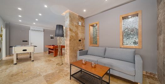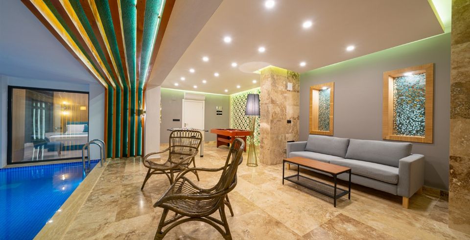 Salon: Geniş, ferah, modern tasarlanmış bir salon ve salonumuzda oturma grubu, TV, DVD, TV ünitesi ve ses sistemi, muhteşem deniz manzarasına sahip olan salonumuzdan havuz başına çıkış bulunmaktadır.