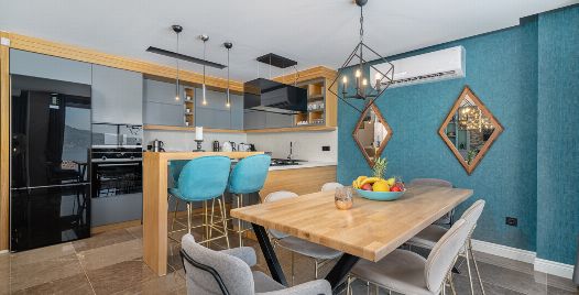 Mutfak: Amerikan ve Ankastre mutfak, Ekmek kızartma makinesi, Elektrikli su ısıtıcısı, 3 adet bar sandalyesi, 8 kişilik masa ve sandalyeler, Buzdolabı, çamaşır makinası, mutfak araç ve gereçlerini bulunmaktadır.