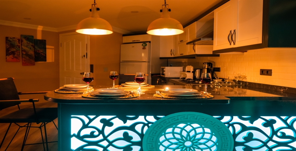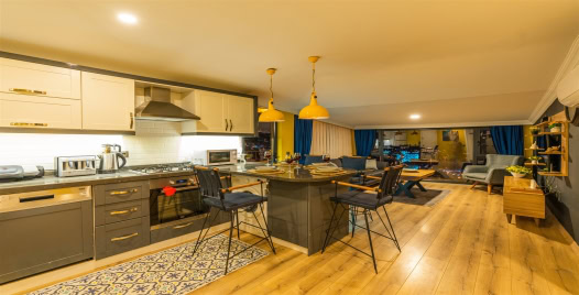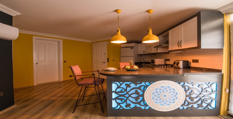 Mutfak : Modern Amerikan mutfak içerisinde buzdolabı, bulaşık makinası, fırın, ocak, mikrodalga fırın, kettle, tost makinası, yemek masası, yemek takımları, çatal ve bıçak takımları, tencere ve tava takımları, bardaklar bulunmaktadır.