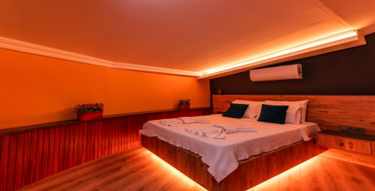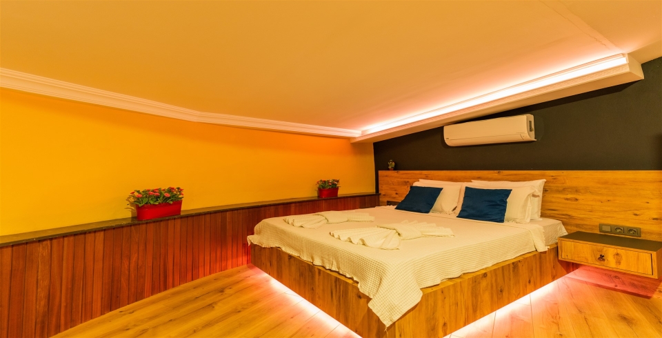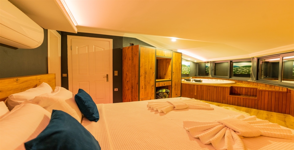 1. Yatak Odası : 1 adet çift kişilik yatak, klima, komodin, elbise dolabı, makyaj masası, jakuzi, banyo ve tuvalet bulunmaktadır.