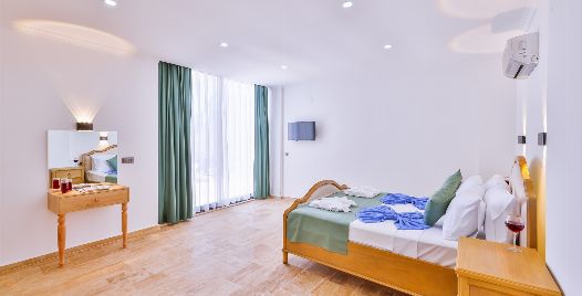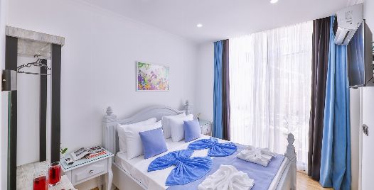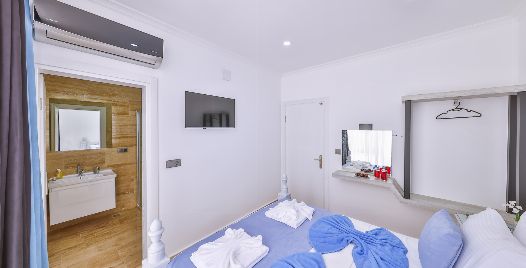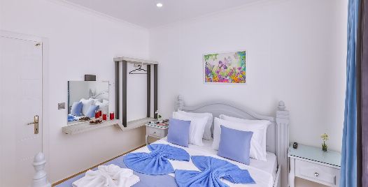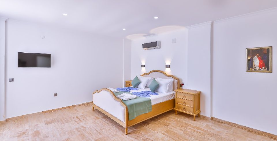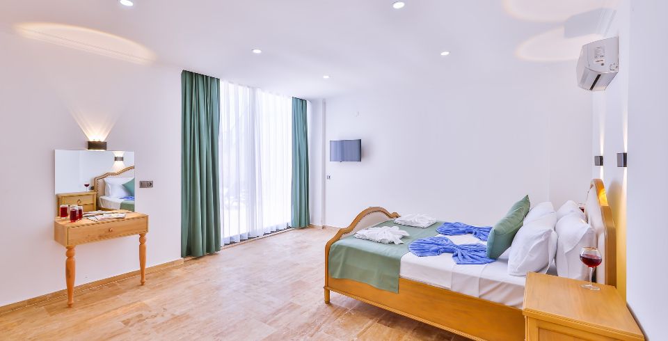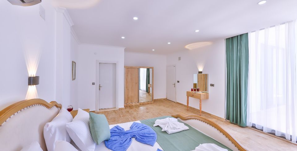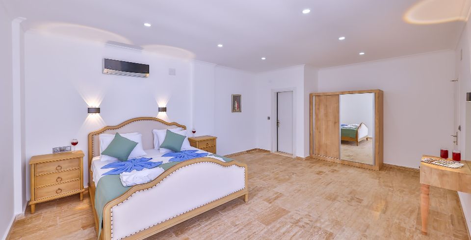 1. Yatak Odası: Çift kişilik yatak, klima, komodin, elbise dolabı, makyaj masası, banyo ve tuvalet bulunmaktadır.