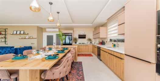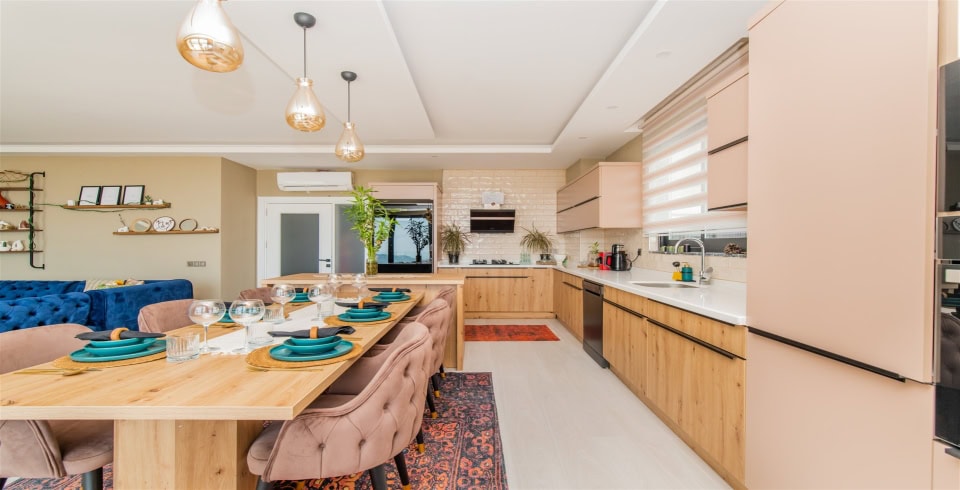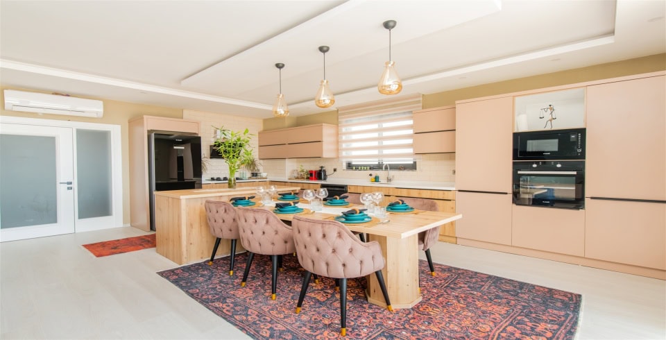 Mutfak: Buzdolabı, bulaşık makinesi, çamaşır makinesi, fırın, ocak, kettle, kahve makinesi, mikrodalga fırın, yemek masası, tencere, tabak, çatak-bıçak takımı vb. ekipmanlar mevcuttur.
