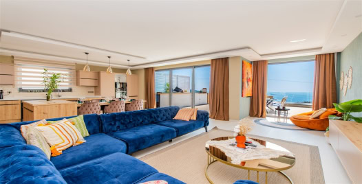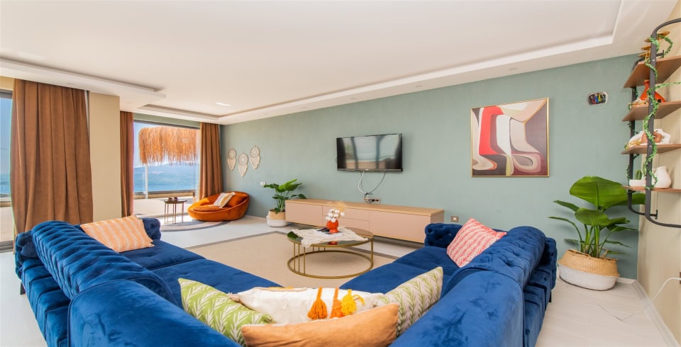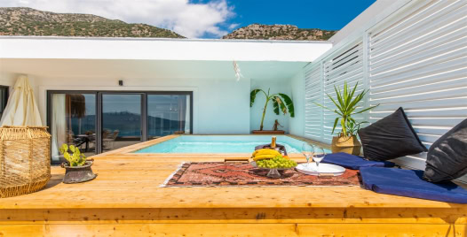 Salon: Modern şık oturma grubu, televizyon, klima, havuz terasına çıkış bulunmaktadır.