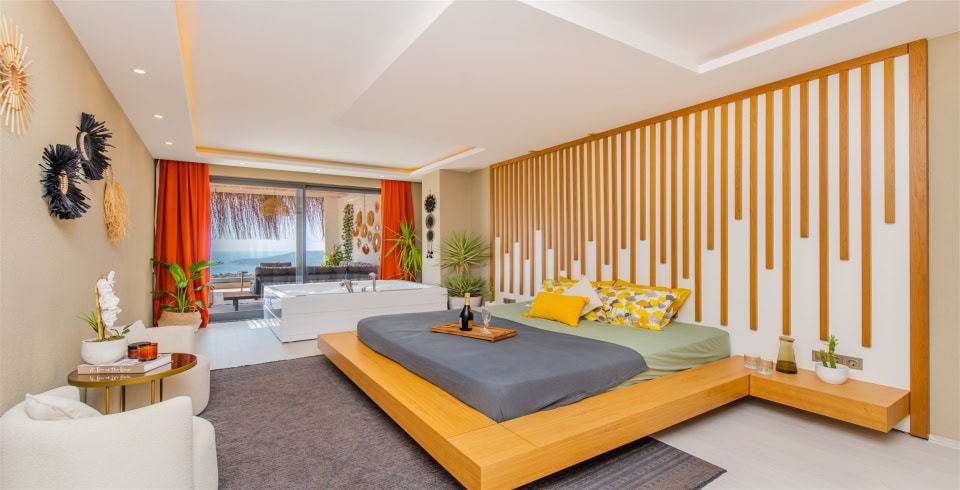 1.Yatak Odası: 1 adet çift kişilik yatak, komodin, elbise dolabı, klima, jakuzi, banyo ve tuvalet bulunmaktadır.