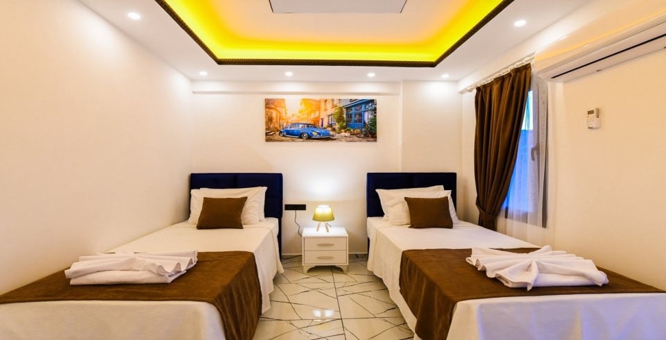 2. Yatak Odası : 2 adet tek kişilik yatak, klima, komodin, makyaj masası, elbise dolabı, banyo ve tuvalet bulunmaktadır.