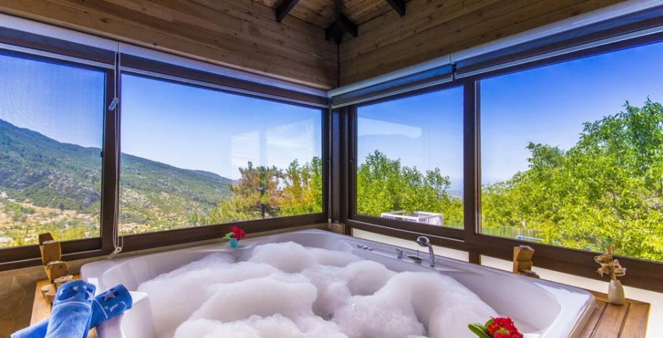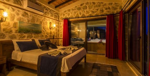 1. Yatak Odası : Doğa ile iç içe olan villamızın yatak odası manzarasında da sizi sonsuz güzel yeşillikler karşılayacak. Eşsiz doğa manzarasına karşı bir de jakuzi bulunmaktadır. Beraberinde çift kişilik yatak, klima, komodin, makyaj masası, banyo ve lavabo bulunmaktadır.