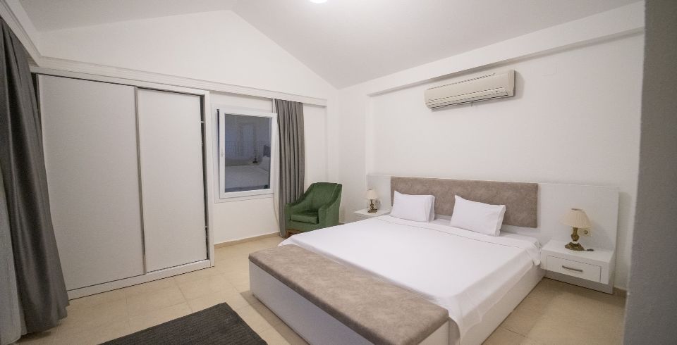 3. Yatak Odası: 1 adet çift kişilik yatak, komodin, makyaj masası, elbise dolabı, klima, ve banyo tuvalet bulunmaktadır.