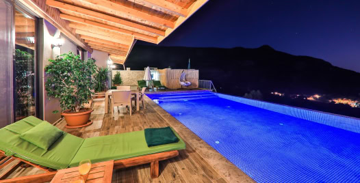 Muhafazakar, korunaklı, tek katlı müstakil villamız Kalkan’ın İslamlar bölgesinde konumlanmıştır. Eşsiz doğa manzarası ile tasarlanmış olup Villa Achyle 2 yatak odalı, 4 kişilik kapasiteye sahiptir. Muhteşem doğası, enfes manzarası ve geniş bahçesiyle sizlerin rahatlığını ön planda tuttuğumuz geniş villamız özenle seçilmiş eşyalarla donatılmış, her şey eksiksiz olarak yerine getirilmiştir. Kalkan’ın İslamlar bölgesinde konumlanan villamız özenle dizayn edilmiş olup havuz ve havuz terası korunaklıdır ve dışarıdan görünmemektedir. Şüphesiz dünyanın en güzel eşsiz manzarasına sahip Kalkan’a karşı bulunan korunaklı villamızın jakuzisinde tatil keyfinize keyif katabilir, tüm yılın yorgunluğunu atabilirsiniz. Oldukça modern bir tasarıma sahip olan villamızda kapalı ısıtma havuzu da bulunmaktadır. Doğa ile iç içe ve panoramik deniz manzarasına sahip villamız Kalkan Merkez’e araç ile 10 dakika mesafe uzaklığındadır. Rahat ve huzur içinde tatil geçireceğinize temin eder, şimdiden keyifli tatiller dileriz.