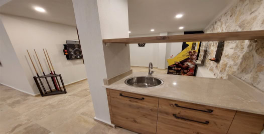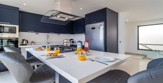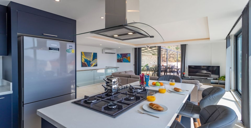 Mutfak: Son teknolojik mutfak aletleri ile dizayn edilmiş modern Amerikan tipi mutfakta yemek masası ve sandalyeler, fırın, mikrodalga kişi sayısı kadar yemek takımı, tost makinesi, tava, çay-su bardakları, tencereler ve çatal bıçak takımları mevcuttur.
