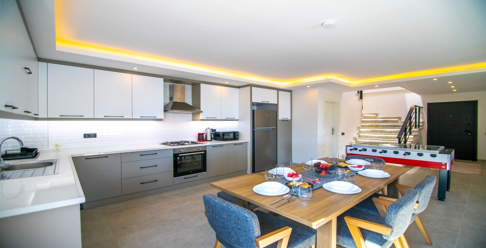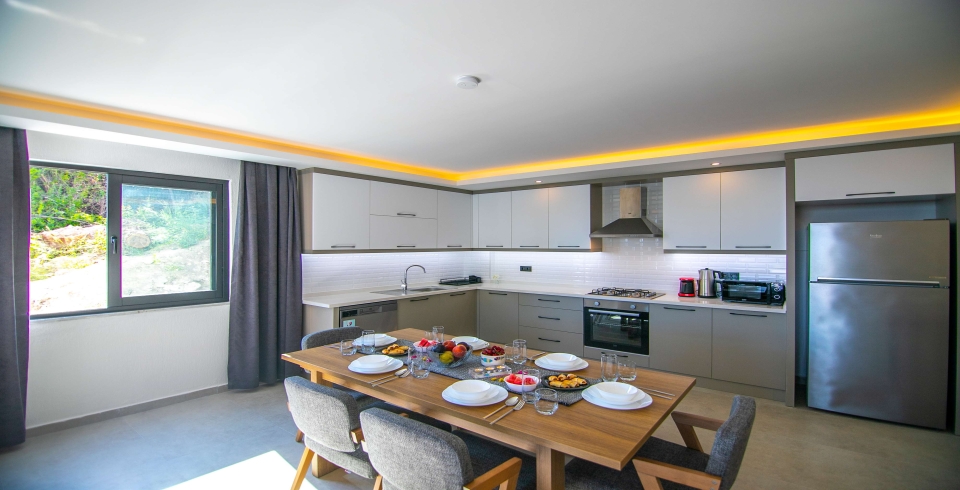 Mutfak : Modern Amerika mutfağımızda yemek masası, buzdolabı, mikrodalga fırın, 4’lü ocak, elektrikli su ısıtıcısı, çatal-bıçak takımı, tencere-tava takımı, bulaşık makinesi çamaşır makinesi, bulunmaktadır.