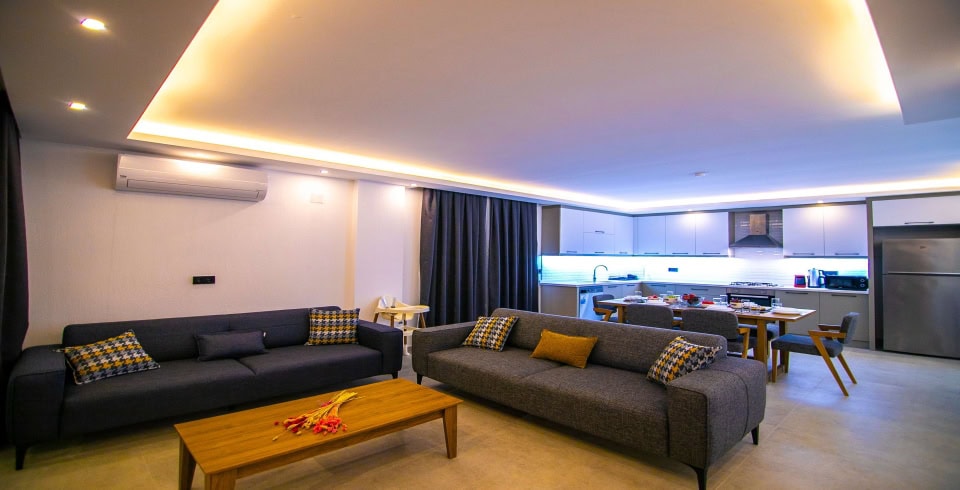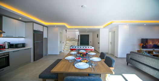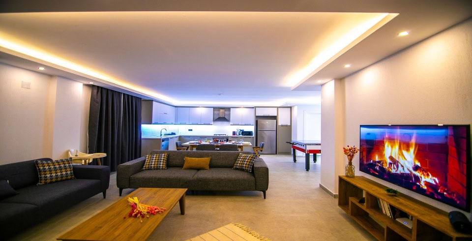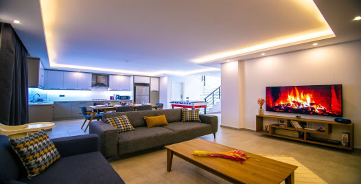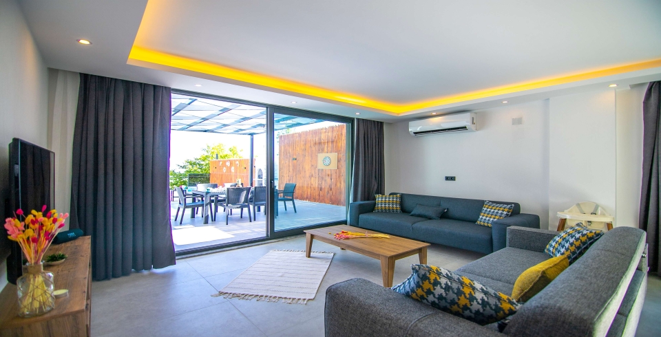 Salon : Villamızın iç dizaynı da son modaya uygun olarak modern bir şekilde tasarlanmıştır. Çeşitli dekoratif eşyalarla süslediğimiz salonumuz havuzlu bahçeye açılıyor. Villa salonunda oturma grubu, TV, internet, klima, sehpa bulunmaktadır.