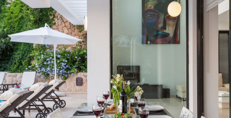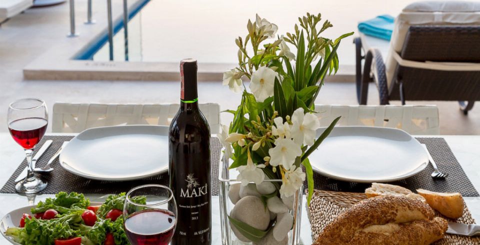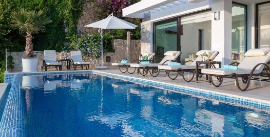 Villanın dış alanında, üç cepheden deniz manzarasına sahip sonsuzluk havuzu ve jakuzili bölüm yer alır. Havuzun hemen yanında güneşlenme alanı, şezlonglar, gölgeli oturma bölümü ve barbekü alanı bulunmaktadır. Geniş teras alanı, sabah kahvaltıları veya gün batımında akşam yemekleri için mükemmel bir ortam sunar.