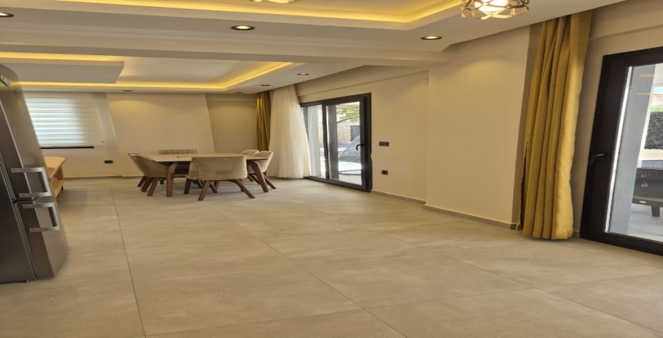 Salon: Oturma grubu, klima, orta sehpa, TV ünitesi ve TV, bulunmaktadır. Havuz terasına çıkış bulunmaktadır.
