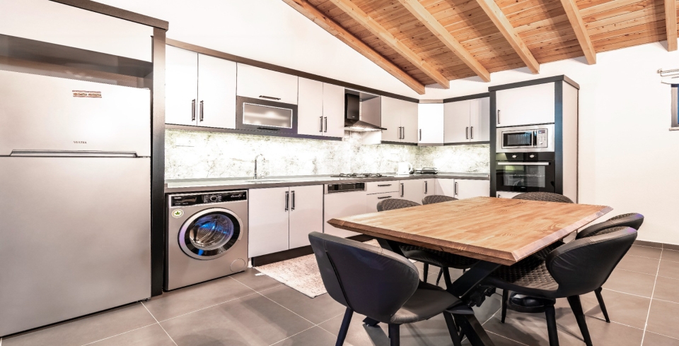 Mutfak: Açık planlı mutfak, 4 kişiye yetecek kadar mutfak malzemeleri, buzdolabı, fırın, ocak, mikrodalga fırın, bulaşık makinesi, çamaşır makinesi, tost makinesi, kettle ve çaydanlık bulunmaktadır..