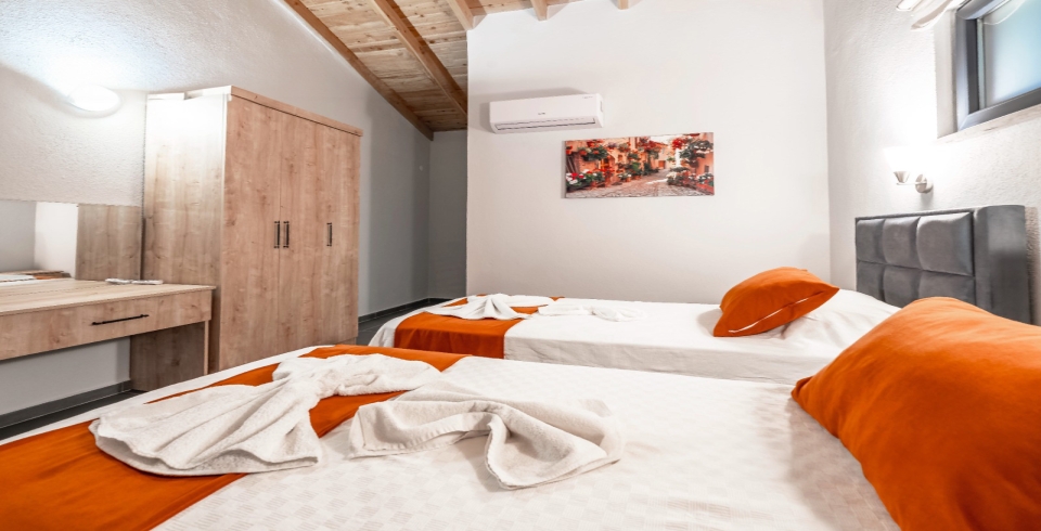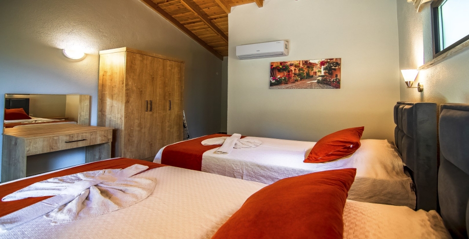 2.Yatak Odası: 2 adet tek kişilik yatak, elbise dolabı, komodin, klima, makyaj masası, banyo ve lavabo bulunmaktadır.
