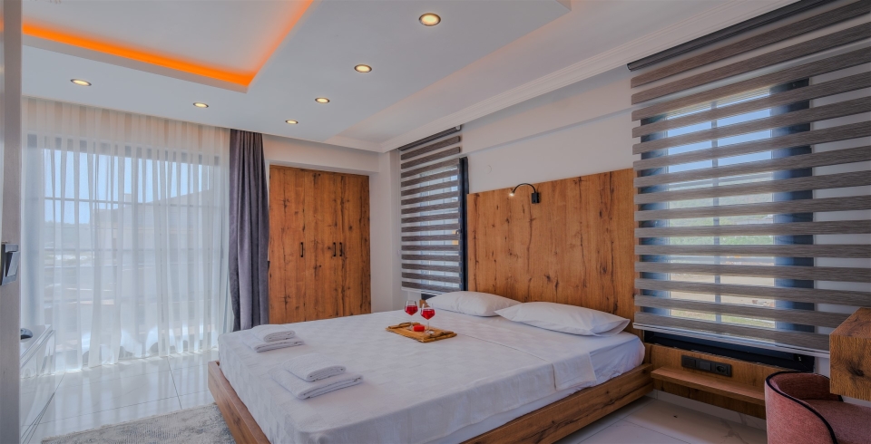 Yatak Odası 1 : 1 adet çift kişilik yatak,klima,jakuzi,komodin,makyaj masası,elbise dolabı,balkon,banyo ve tuvalet bulunmaktadır.