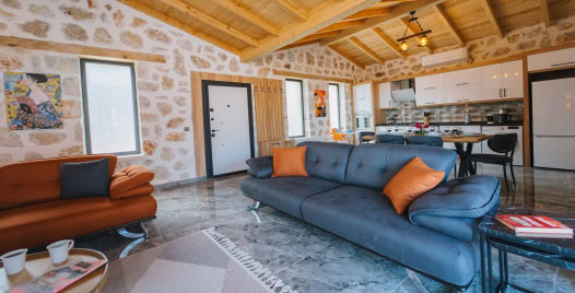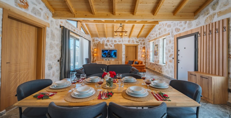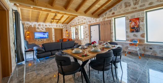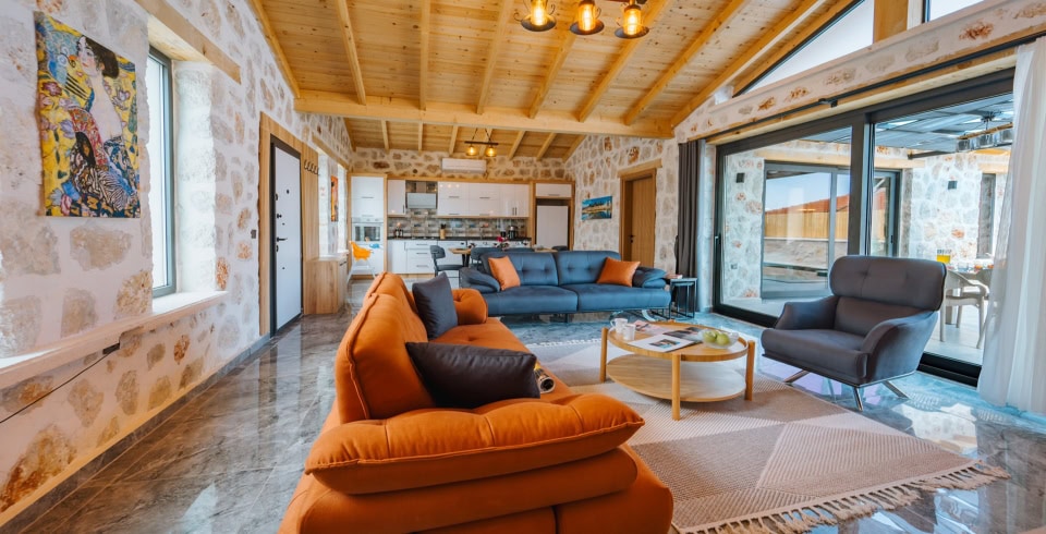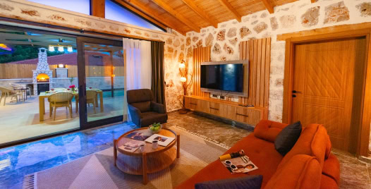 Salon : Villamızın iç dizaynı da son modaya uygun olarak modern bir şekilde tasarlanmıştır. Çeşitli dekoratif eşyalarla süslediğimiz salonumuz havuzlu bahçeye açılıyor. Villa salonunda oturma grubu, TV, internet, klima, sehpa bulunmaktadır.