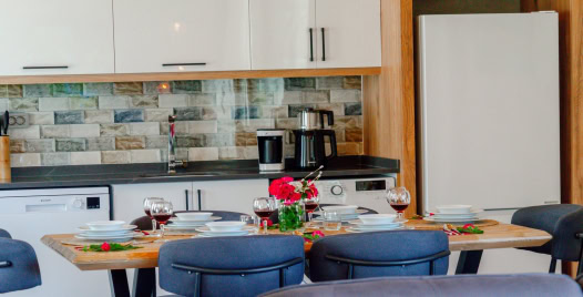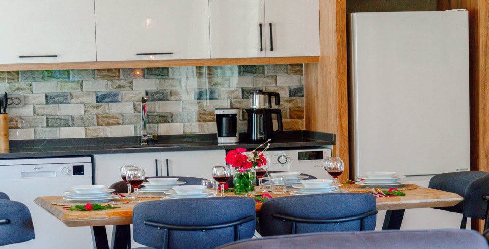 Mutfak : Modern Amerika mutfağımızda yemek masası, buzdolabı, 4’lü ocak, kahve makinası, çatal-bıçak takımı, tencere-tava takımı, bulaşık makinesi çamaşır makinesi, bulunmaktadır.