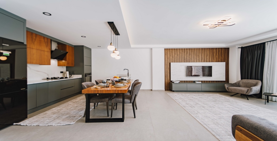 Geniş açık plan salon, konforlu oturma grubu, TV ve Wi-Fi ile donatılmış olup havuz terasına açılan kapısı sayesinde iç-dış yaşam ilişkisi güçlüdür. Mutfak kısmı tam donanımlı olup; buzdolabı, bulaşık makinesi, ocak, fırın, çamaşır makinesi ve temel mutfak gereçleri içerir.