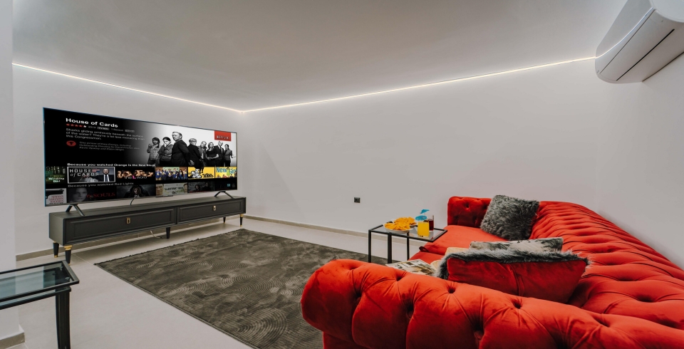 Salon: Salonda modern oturma takımı, televizyon, kablosuz internet, klima, orta sehpa ve havuz terasına çıkış imkânı mevcuttur.
