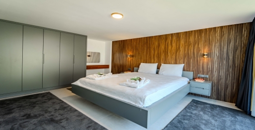 1. Yatak Odası: Ana suit yatak odasıdır. İçerisinde çift kişilik yatak, küvet, klima, elbise dolabı, makyaj masası, komodin ve özel banyo & WC yer almaktadır.