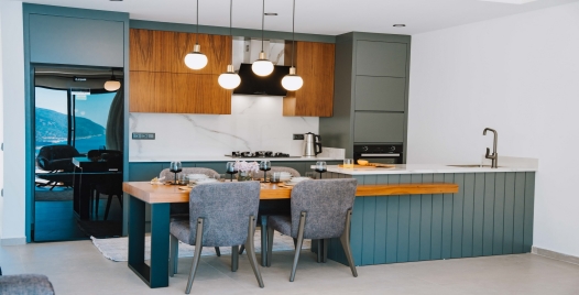Mutfak: Geniş ve modern şekilde tasarlanmış Amerikan mutfakta buzdolabı, bulaşık makinesi, fırın, 4’lü ankastre ocak, çamaşır makinesi, çay makinesi, tava & tencere gibi mutfak gereçleri, yemek takımı ve 4 kişilik yemek masası bulunmaktadır.