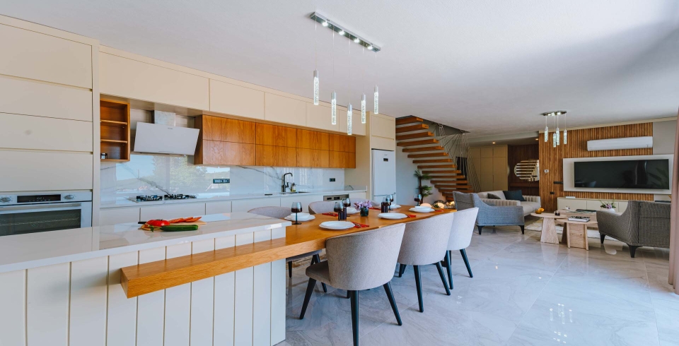 Mutfak: Açık planlı mutfak, 6 kişiye yetecek kadar mutfak malzemeleri, buzdolabı, fırın, ocak, mikrodalga fırın, bulaşık makinesi, çamaşır makinesi, tost makinesi, kettle ve çaydanlık bulunmaktadır..