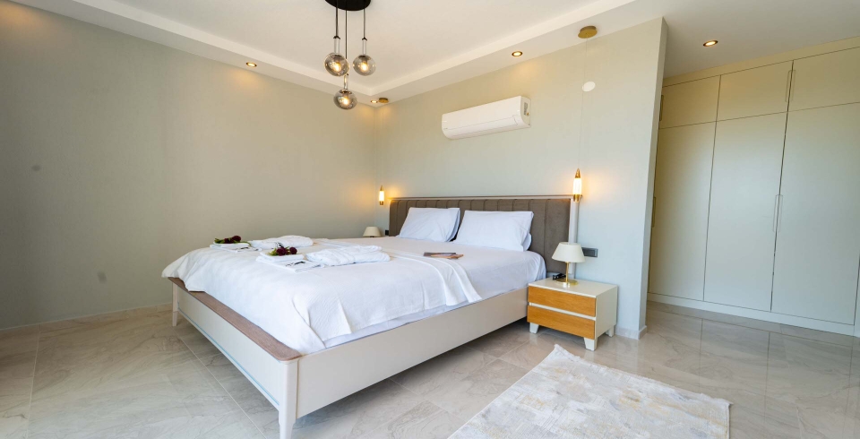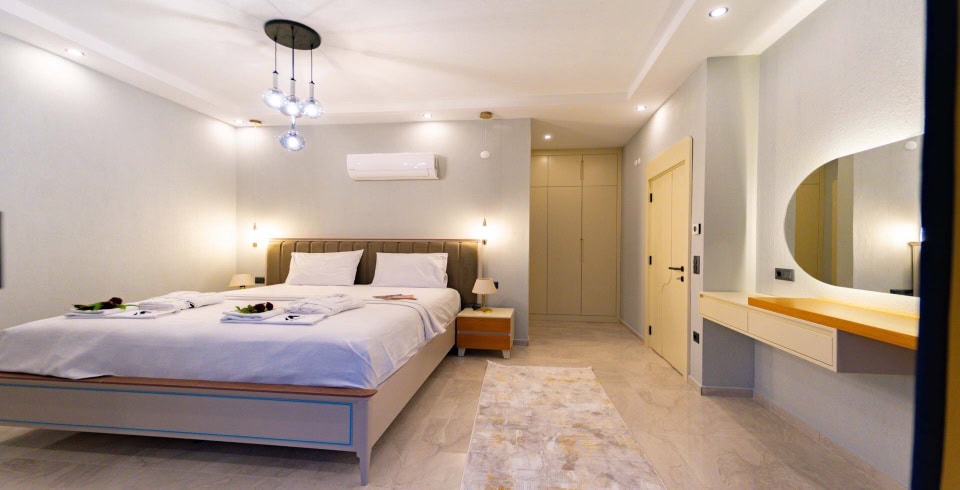 3.Yatak Odası: 1 adet çift kişilik yatak, elbise dolabı, komodin, klima, makyaj masası, banyo ve lavabo bulunmaktadır.