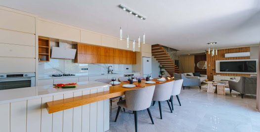 Salon: Özenle döşenmiş salon, modern koltuklar, 6 kişilik yemek masası, LCD TV ve klima bulunmaktadır.