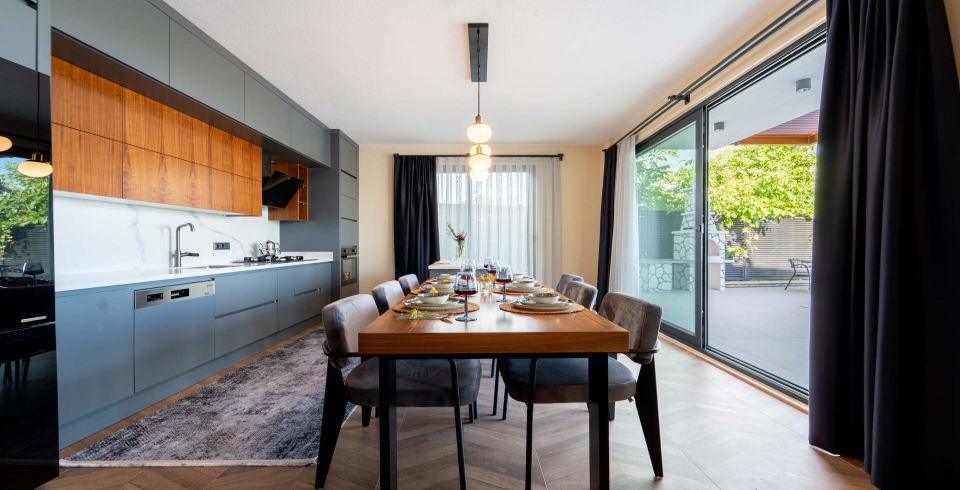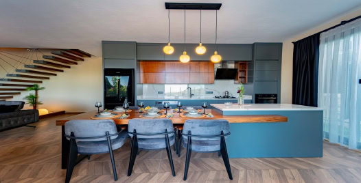 Mutfak: Açık planlı mutfak, 6 kişiye yetecek kadar mutfak malzemeleri, buzdolabı, fırın, ocak, mikrodalga fırın, bulaşık makinesi, çamaşır makinesi, tost makinesi, kettle ve çaydanlık bulunmaktadır..
