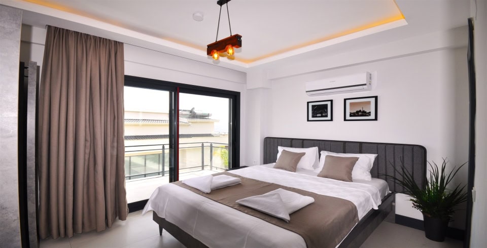 1.Yatak Odası: Çift kişilik yatak, Komodin, Klima, Elbise dolabı, Banyo, Deniz manzaralı balkon bulunmaktadır.