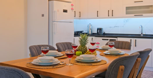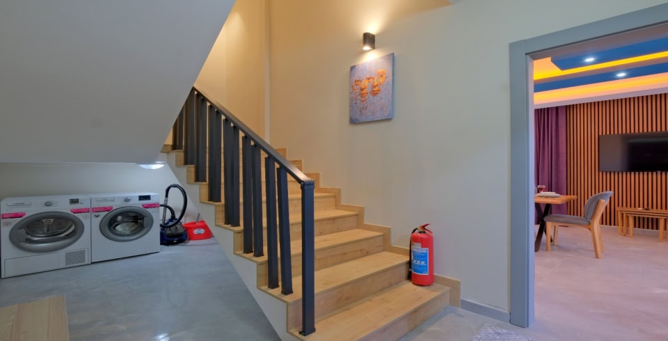 Mutfak: Açık planlı mutfak, 6 kişi ve daha fazla kişiye yetecek kadar mutfak malzemeleri, buzdolabı, fırın, ocak, mikrodalga fırın, bulaşık makinesi, çamaşır makinesi, tost makinesi, kettle ve çaydanlık bulunmaktadır..