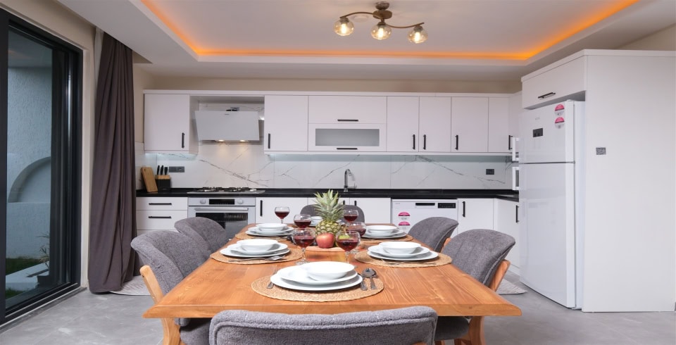 Mutfak: Açık planlı mutfak, 6 kişi ve daha fazla kişiye yetecek kadar mutfak malzemeleri, buzdolabı, fırın, ocak, mikrodalga fırın, bulaşık makinesi, çamaşır makinesi, tost makinesi, kettle ve çaydanlık bulunmaktadır..
