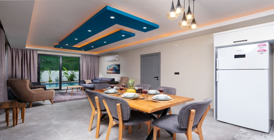 Salon: Özenle döşenmiş salon, modern koltuklar, 6 kişilik yemek masası, LCD TV ve klima bulunmaktadır.