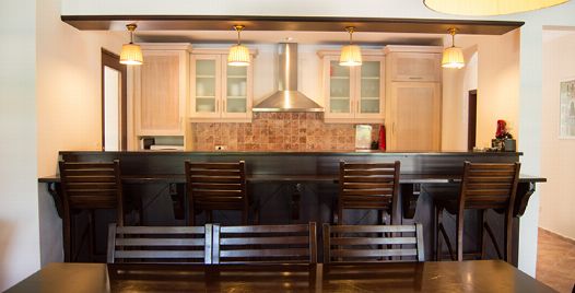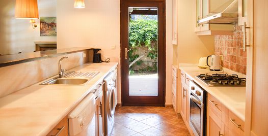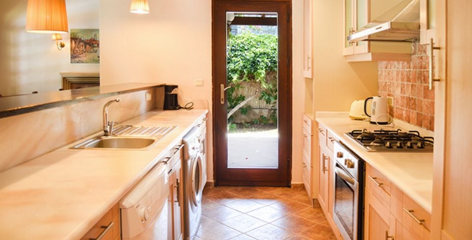 Mutfak : Amerikan mutfakta buz dolabı, bulaşık makinesi, fırın, mikrodalga fırın, 4’lü ocak (ankastre), elektrikli su ısıtıcı, 8 kişilik yemek takımları, çatal ve bıçak takımları, tencere ve tava takımları, bardaklar bulunmaktadır.