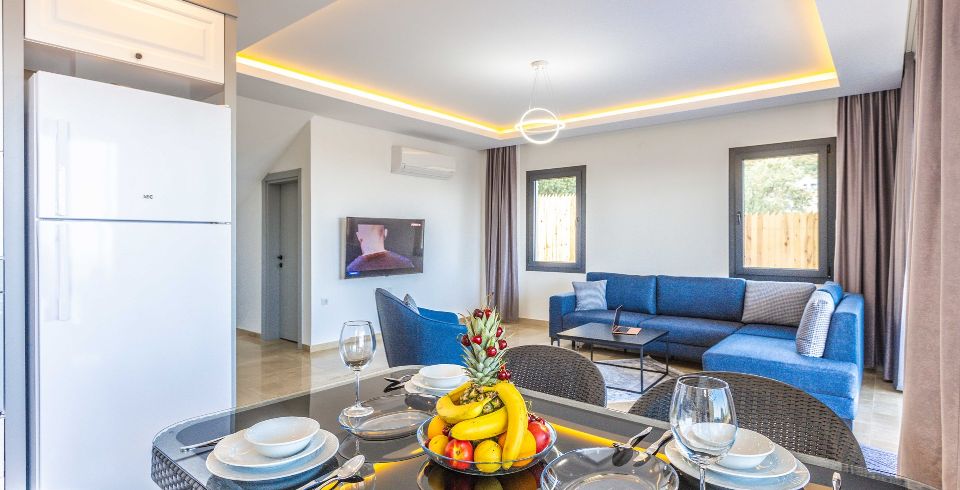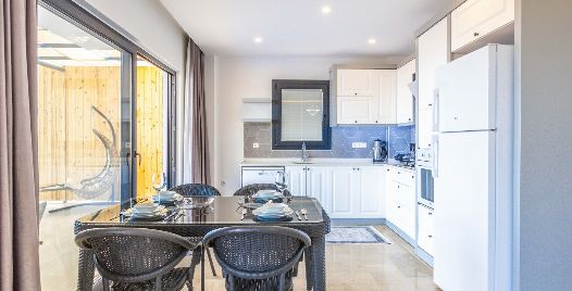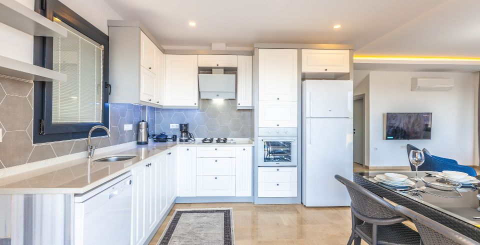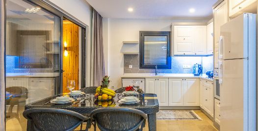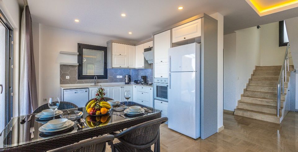 Mutfak: Amerikan mutfak bulunmaktadır. Mutfakta mikrodalga fırın, bulaşık makinası, ankastre fırın, buzdolabı, çamaşır makinası, ankastre 4’lü ocak, elektrikli su ısıtıcı kettle, ekmek kızartma makinası, tencere ve tava takımı, yemek takımı, kaşık ve çatal seti ve bardaklar bulunmaktadır. Mutfak havuz katındadır.