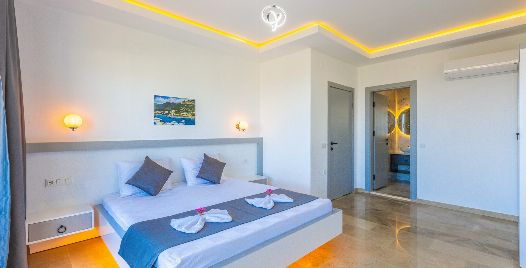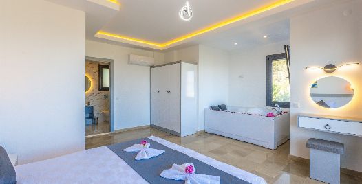 1. Yatak Odası: Oda içerisinde 1 adet çift kişilik yatak, jakuzi, gardırop, komodin, banyo-WC yer almaktadır.