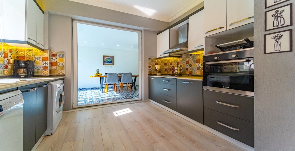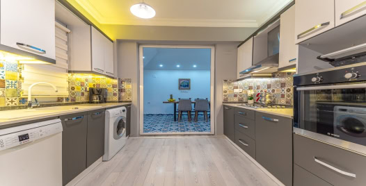 Mutfak: Modern Amerikan mutfakta buzdolabı, çamaşır makinesi, bulaşık makinesi, fırın, mikrodalga fırın, tost makinası, 4'lü ocak, elektrikli su ısıtıcısı, yemek takımı ve mutfak araç gereçleri bulunmaktadır.