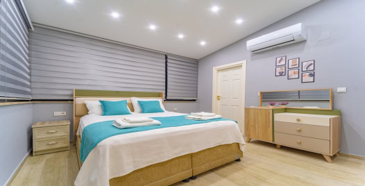 1. Yatak Odası : 1 adet çift kişilik yatak, klima makyaj masası, komodin ve elbise dolabı, banyo ve tuvalet bulunmaktadır.