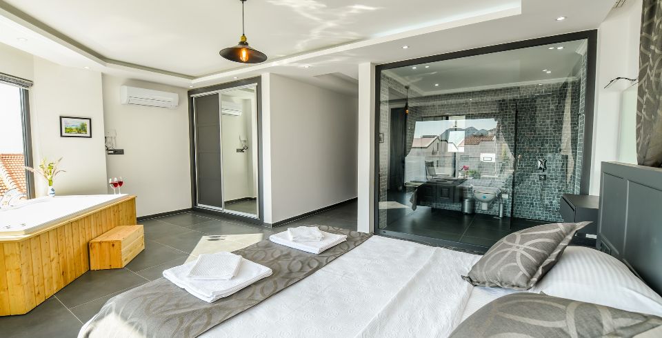 1. Yatak Odası : Çift kişilik süit yatak odası, jakuzili klima, makyaj masası, elbise dolabı, komodin, banyo ve lavabo bulunmaktadır.