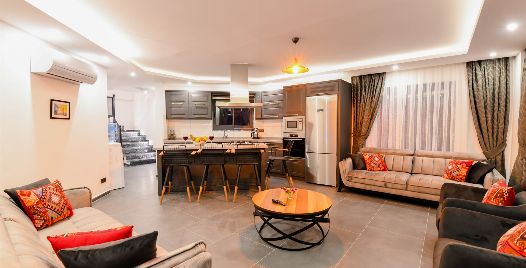 Salon : Salon içerisinde oturma grubu TV, uydu, klima, sehpa bulunmaktadır. Salonumuzdan havuz terasına çıkış yapılabilmektedir.