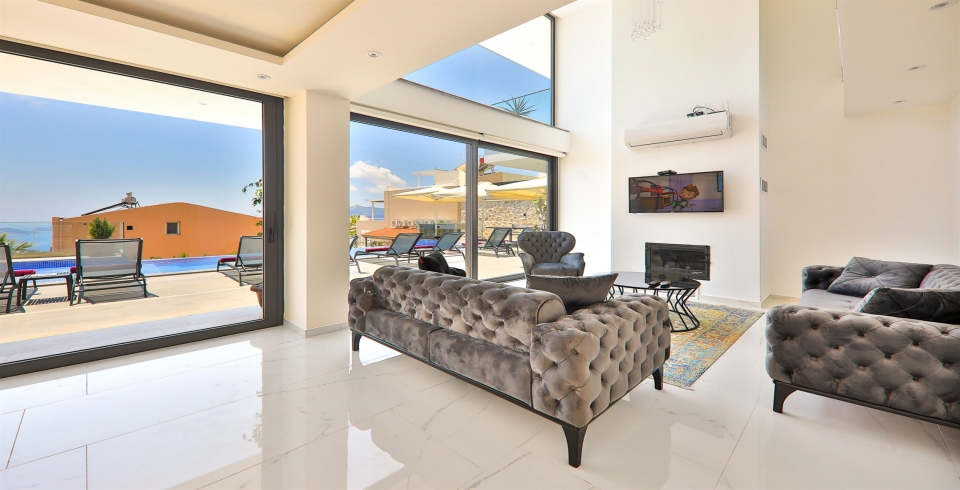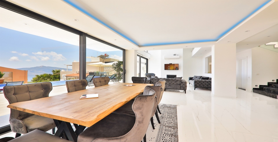 Salon : Deniz Manzaralı , Oturma Grubu, LCD TV, 8 Kişilik yemek masası, Havuz kenarına çıkış bulunmaktadır. Su Sebili bulunmaktadır.