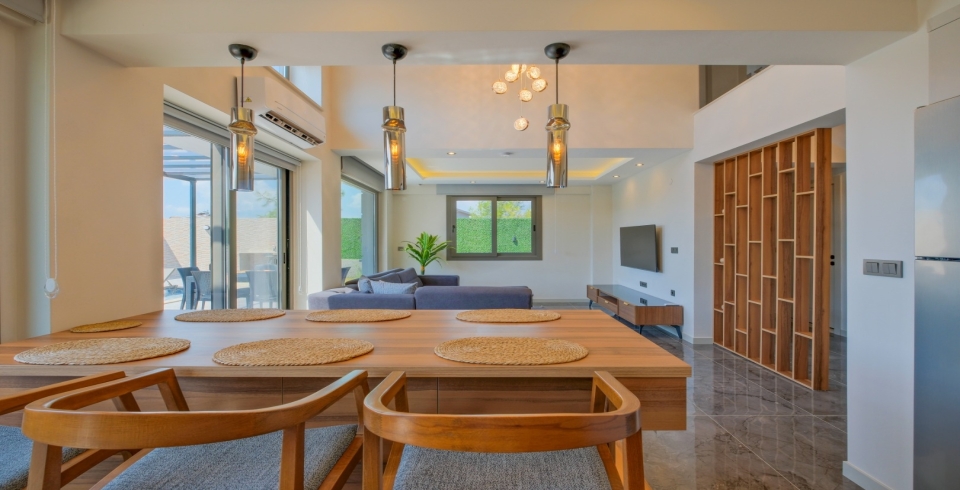 Salon: Oturma grubu, klima, orta sehpa, TV ünitesi ve TV, bulunmaktadır. Havuz terasına çıkış bulunmaktadır.