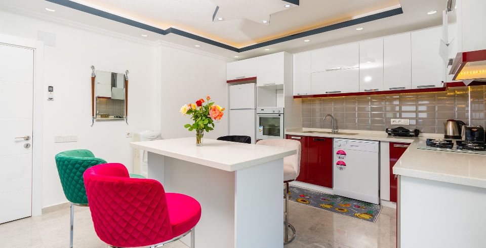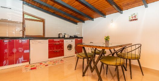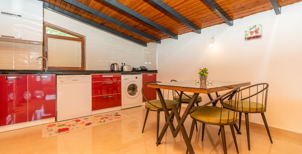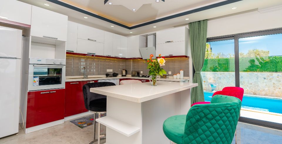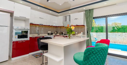 Mutfak : Villamızın geniş Amerikan mutfağı ile sizlere kendi evinizin mutfağı gibi hissettirecek. Ayrıca mutfakta klima, bulaşık makinası, buzdolabı, çamaşır makinası, tost makinası, su ısıtıcısı, fırın, 4`lü ocak seti ve yemek masası ile tava tencere vb. mutfak araç gereçlerini kullanma fırsatını sizlere sunuyoruz.