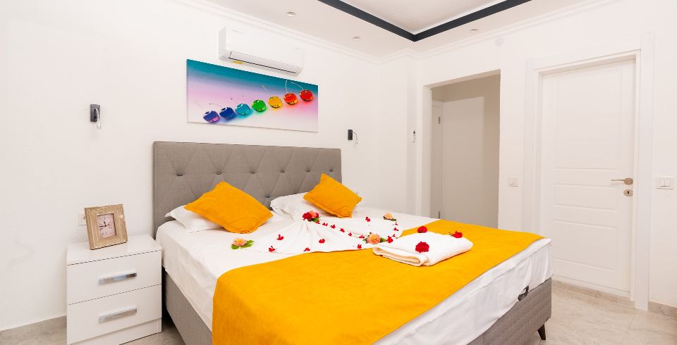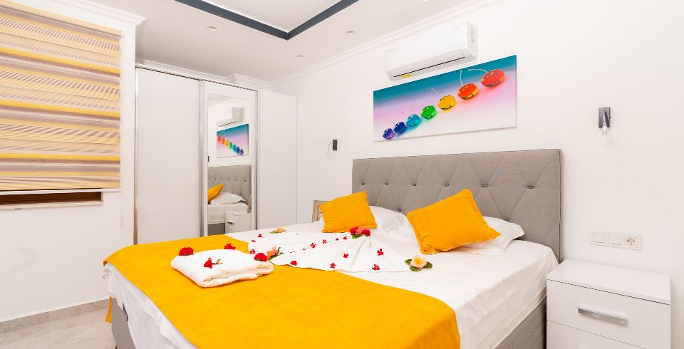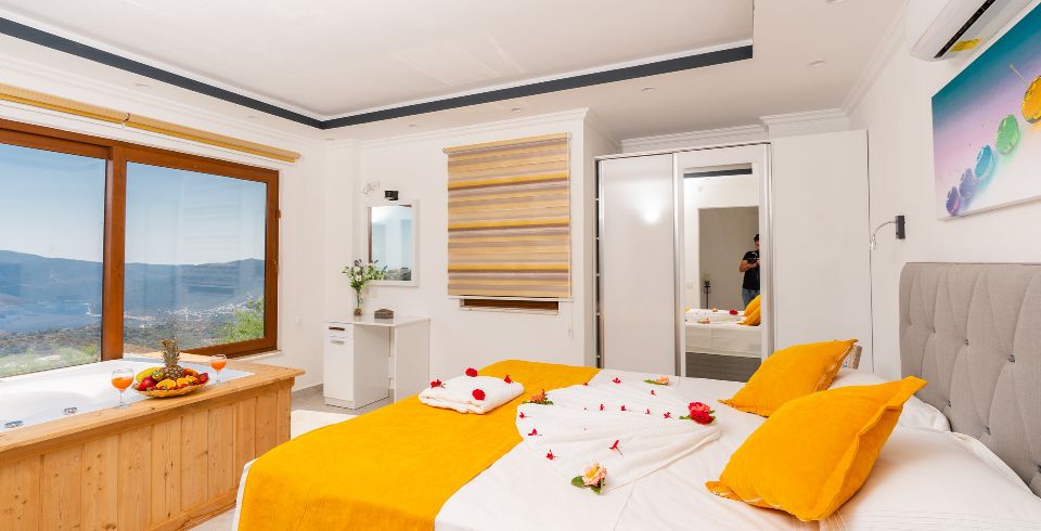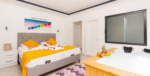 2. Yatak Odası : 1 adet çift kişilik yatak, klima, elbise dolabı, makyaj masası, komodin, jakuzi, banyo ve lavabo bulunmaktadır.