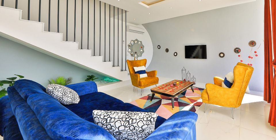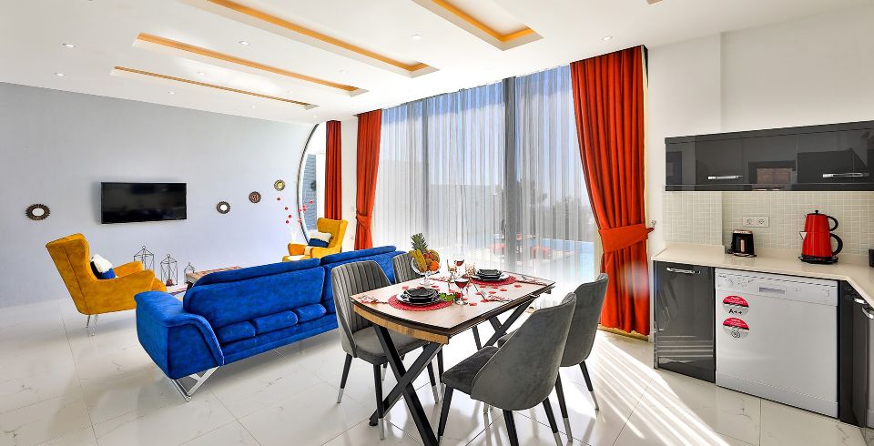Salon kısmında oturma grubu, TV, klima ve havuz terasına çıkış sağlayan kapılar mevcuttur. Amerikan mutfak, buzdolabı, fırın, ocak, mikrodalga ve temel mutfak gereçleriyle tam donanımlıdır. Bahçe alanı şezlonglar, güneş şemsiyesi, dış oturma alanı ve barbekü ile desteklenmiştir.