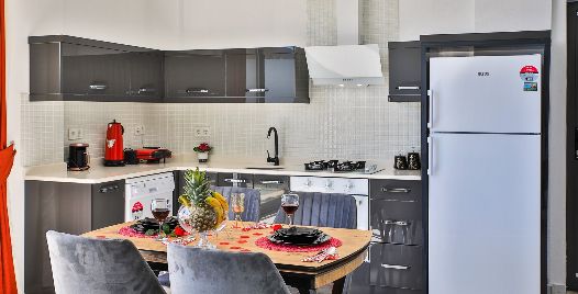 Mutfak : Villamızın geniş Amerikan mutfağı ile sizlere kendi evinizin mutfağı gibi hissettirecek. Ayrıca mutfakta klima, bulaşık makinası, buzdolabı, çamaşır makinası, mikrodalga fırın, tost makinası, ekmek kızartma, su ısıtıcısı, fırın, 4'lü ocak seti ve 2 kişilik yemek masası ile tava tencere vb. mutfak araç gereçlerini kullanma fırsatını sizlere sunuyoruz.