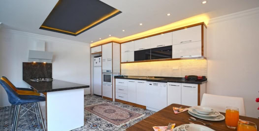 Mutfak : Modern Amerika mutfağımızda 4 kişilik yemek masası, buzdolabı, çamaşır makinesi, 4’lü ocak, tost makinesi, elektrikli su ısıtıcısı, çatal-bıçak takımı, tencere-tava takımı, bulaşık makinesi bulunmaktadır.