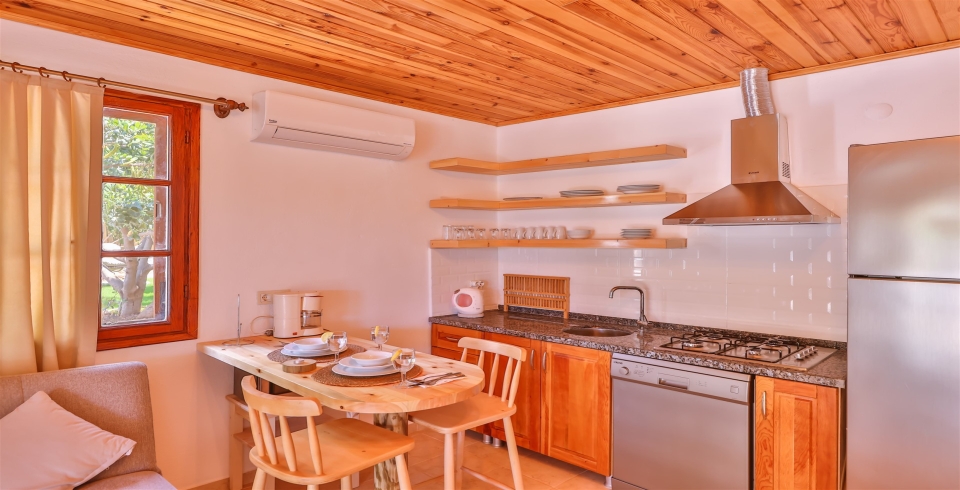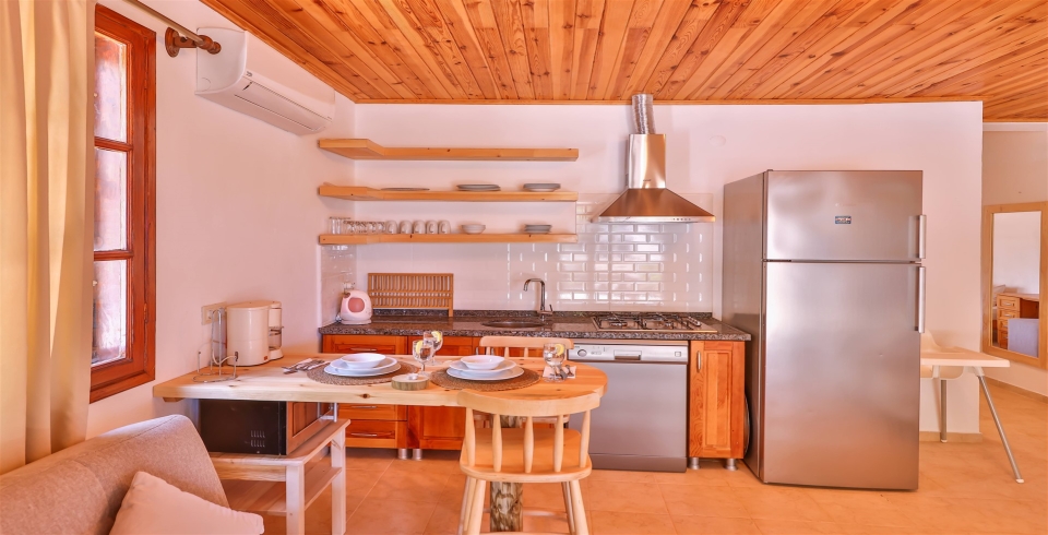 Mutfak : Buzdolabı, çamaşır makinesi, mikrodalga fırın, 4’lü ocak, elektrikli su ısıtıcısı, çatal-bıçak takımı, tencere-tava takımı, bulaşık makinesi bulunmaktadır.