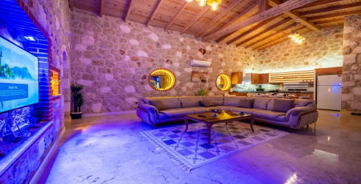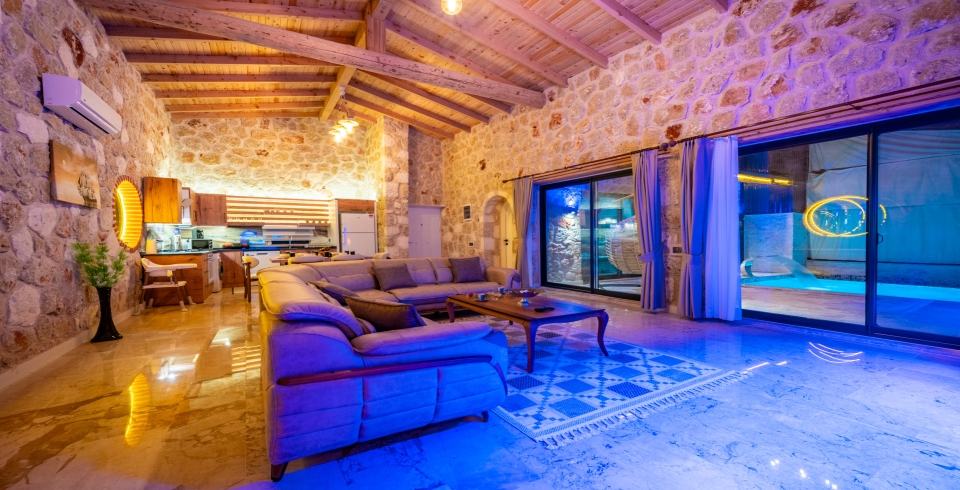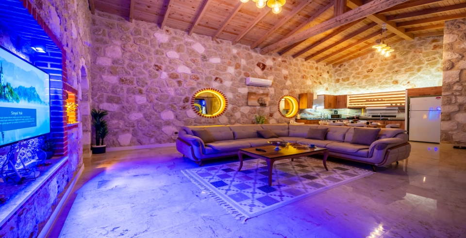 Salon : Villa salonunda oturma grubu, TV, internet, klima, sehpa bulunmaktadır.